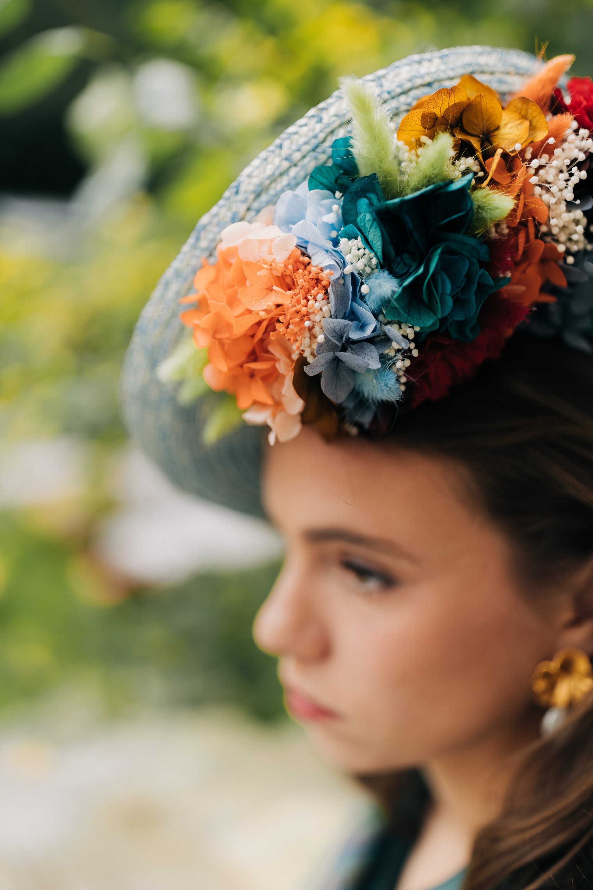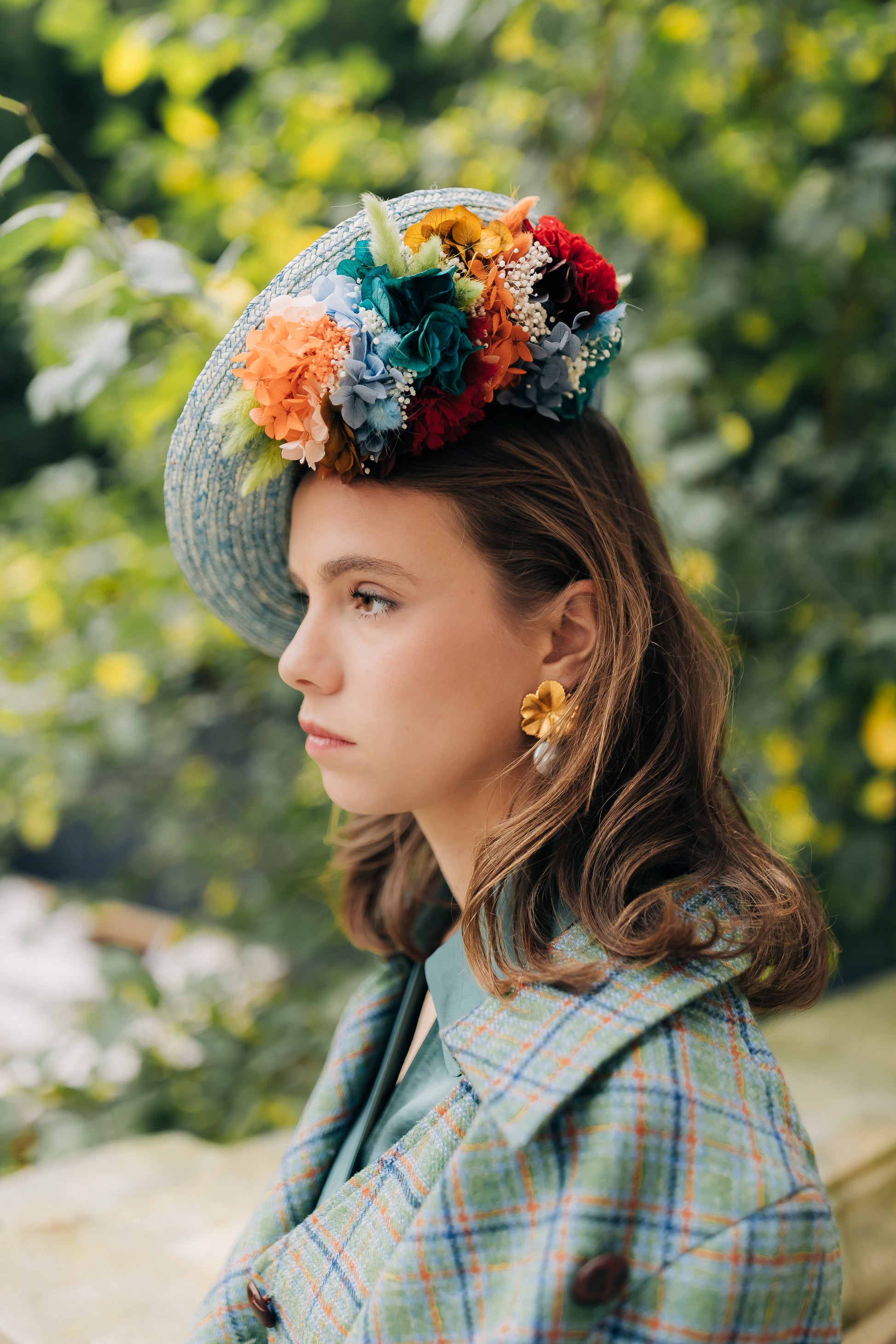 Le bibi Gismonda s’inspire des compositions florales et des arabesques aériennes des œuvres de Mucha, mêlant élégance et délicatesse. Les fleurs naturelles, stabilisées pour conserver leur éclat, se déploient avec grâce sur la base bleue, créant un jeu de textures et de couleurs harmonieux.