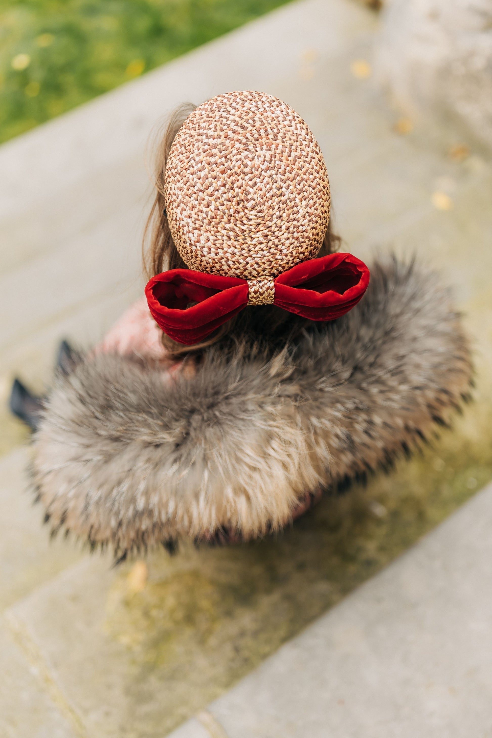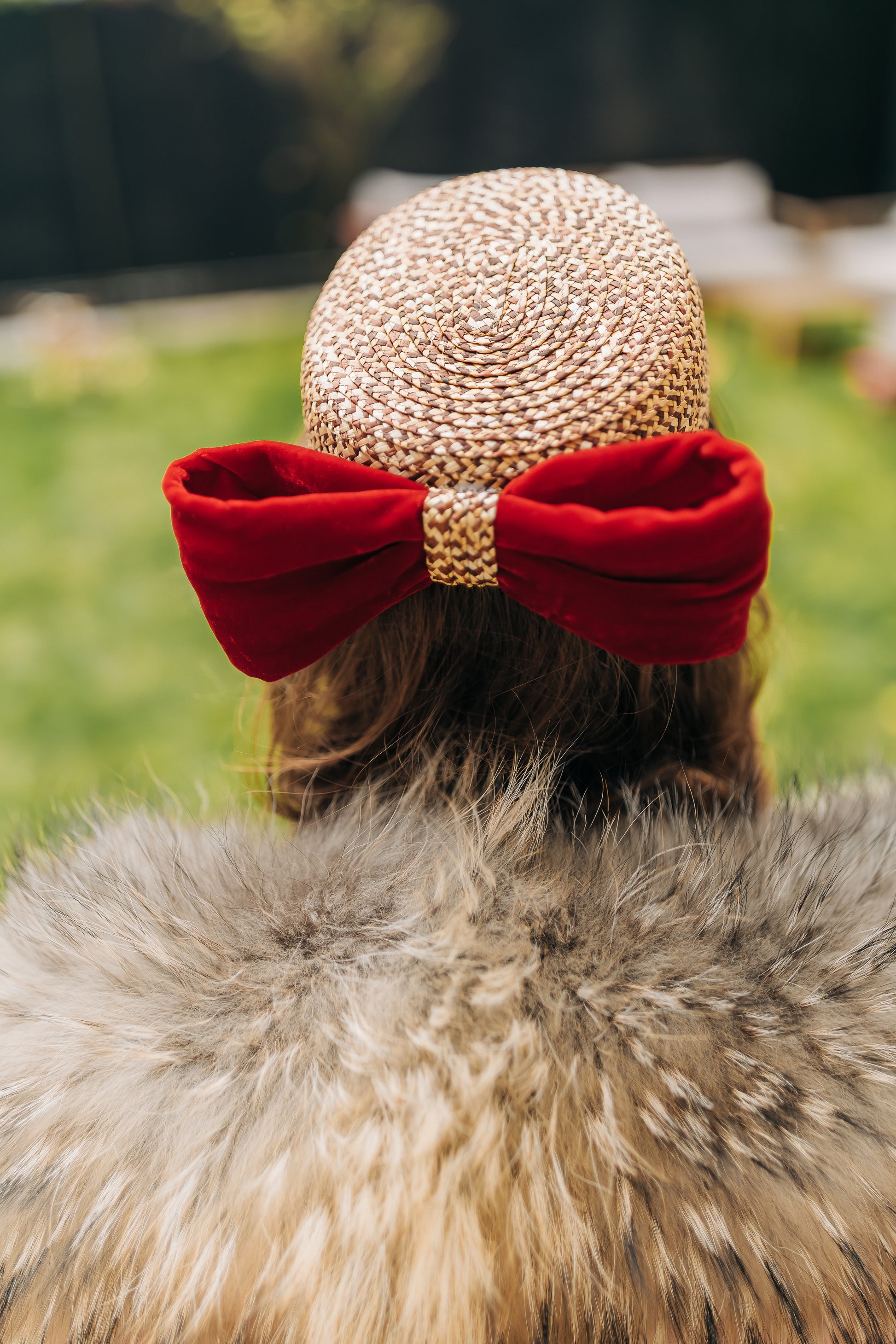 Paille bicolore marron et beige avec nœud en velours de soie rouge, pour un style audacieux et dynamique.