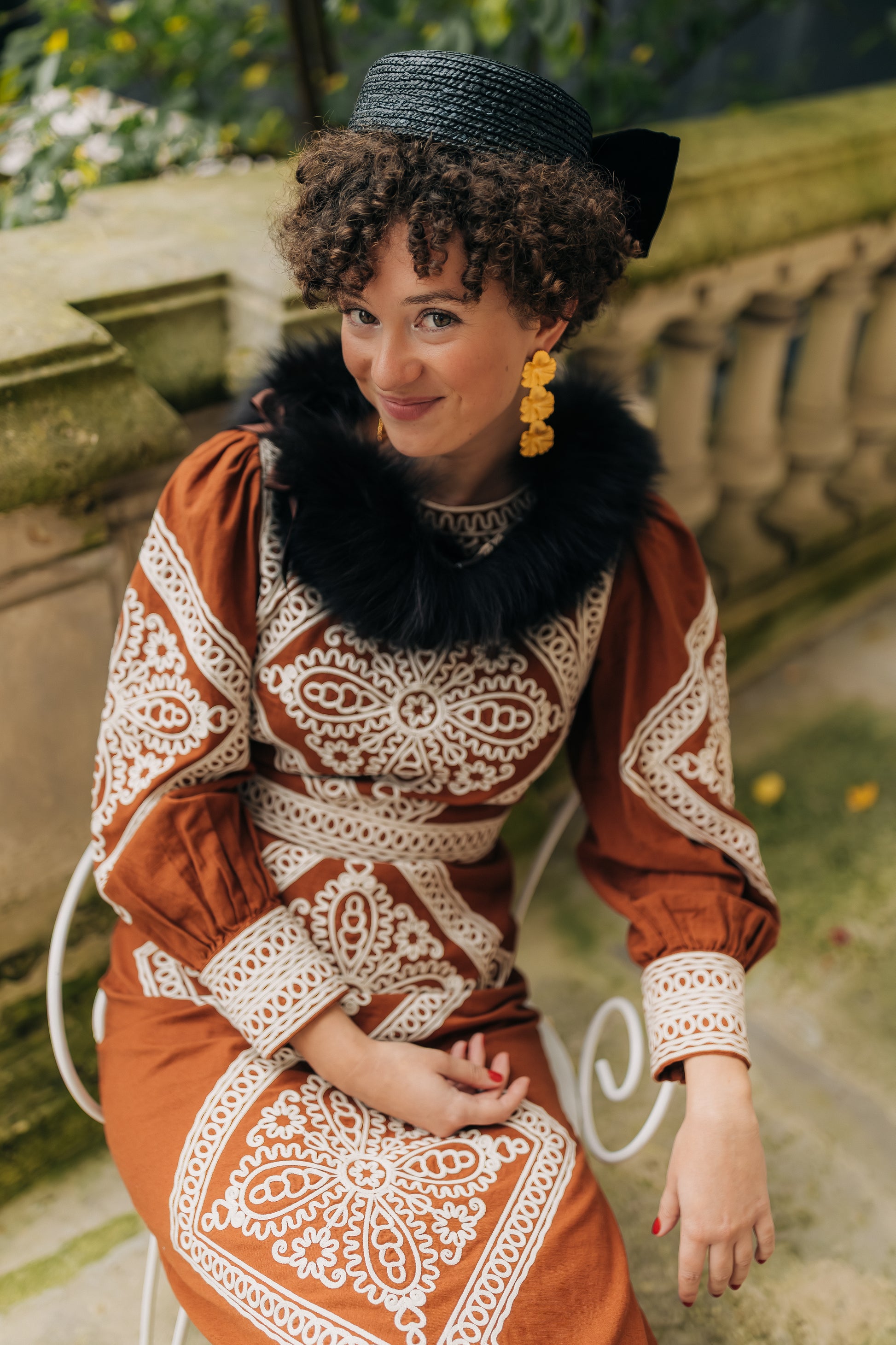 Les robes longues en velours, les fourrures, les teintes mordorées et automnales prolongent cette atmosphère de fin de siècle : un monde de théâtre, de raffinement et de liberté créatrice.