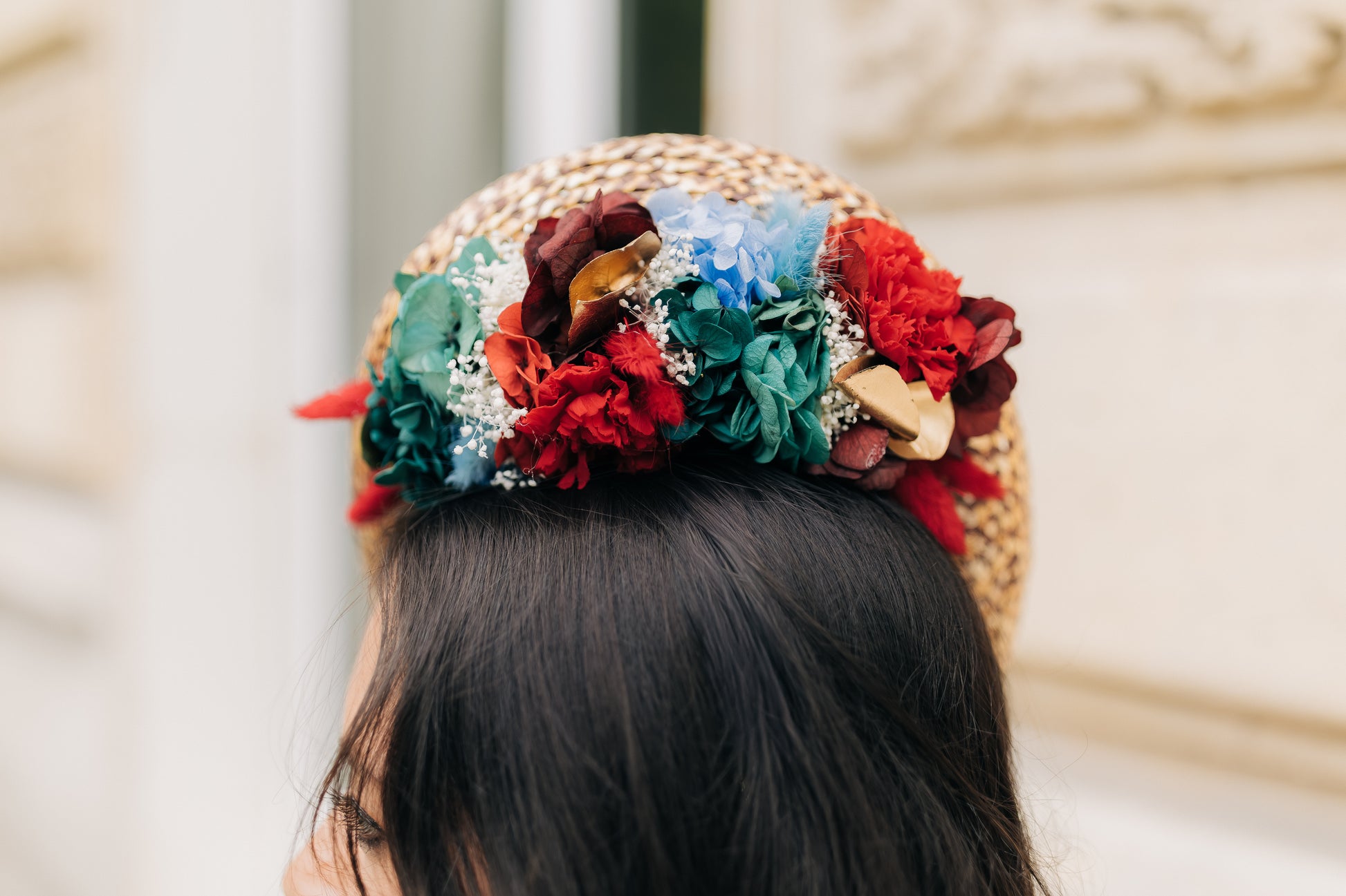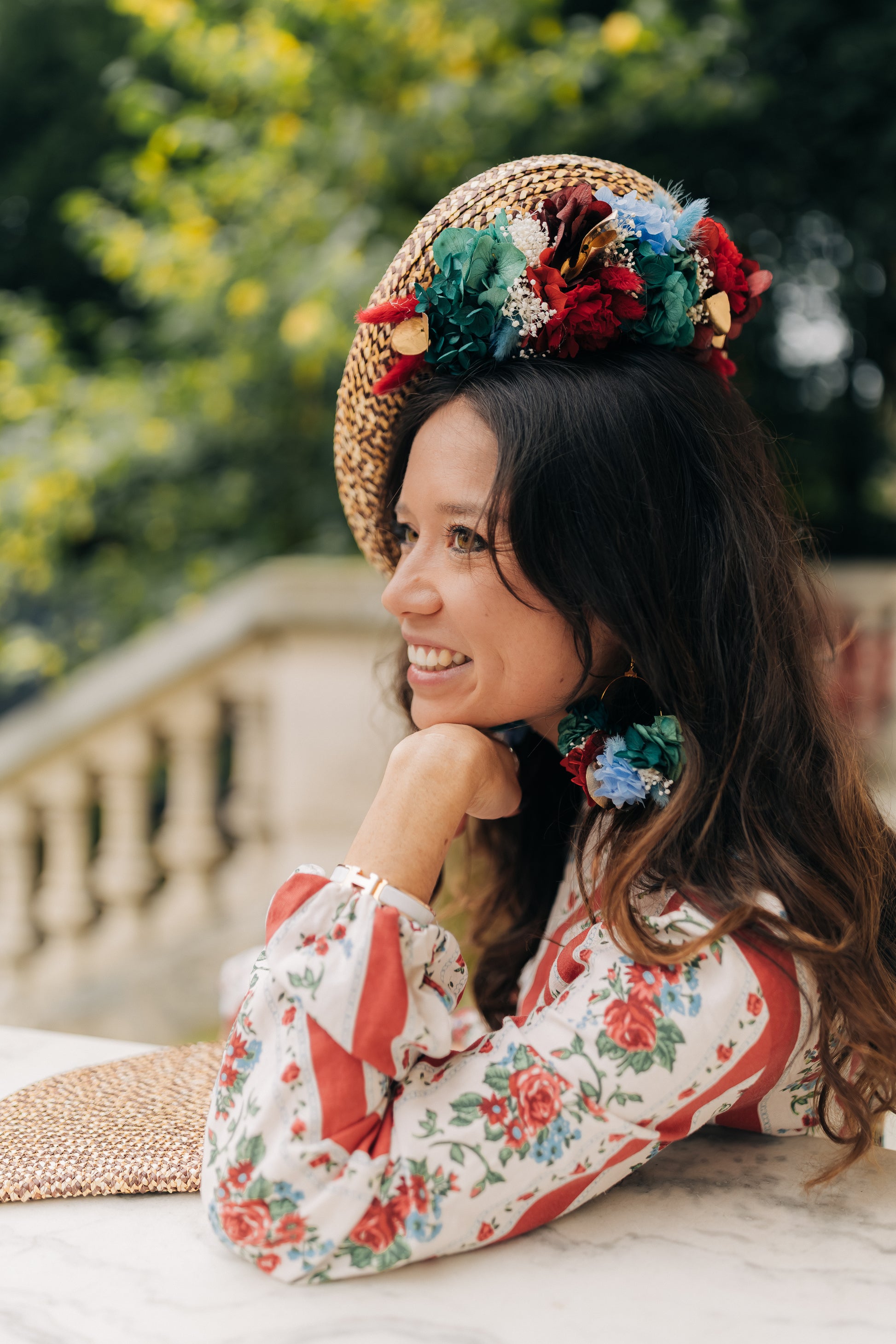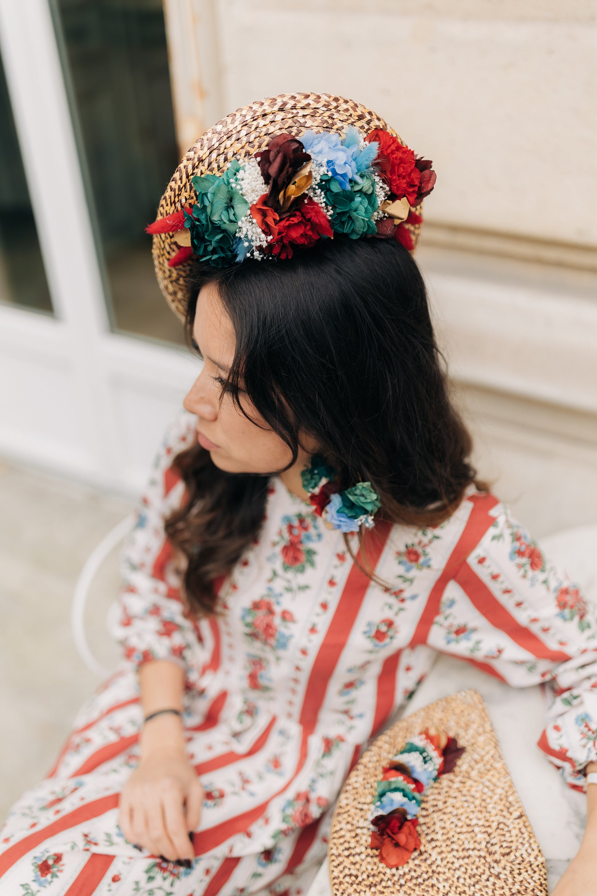 Le bibi Sarah Bernhardt s’inspire des compositions florales et des arabesques aériennes des œuvres de Mucha, mêlant élégance et délicatesse. Les fleurs naturelles, stabilisées pour conserver leur éclat, se déploient avec grâce sur la base tigrée, créant un jeu de textures et de couleurs harmonieux.