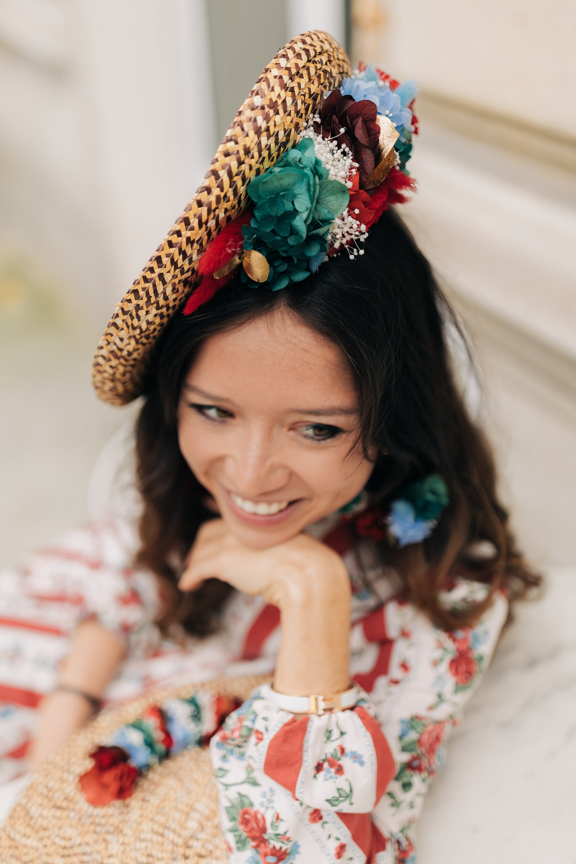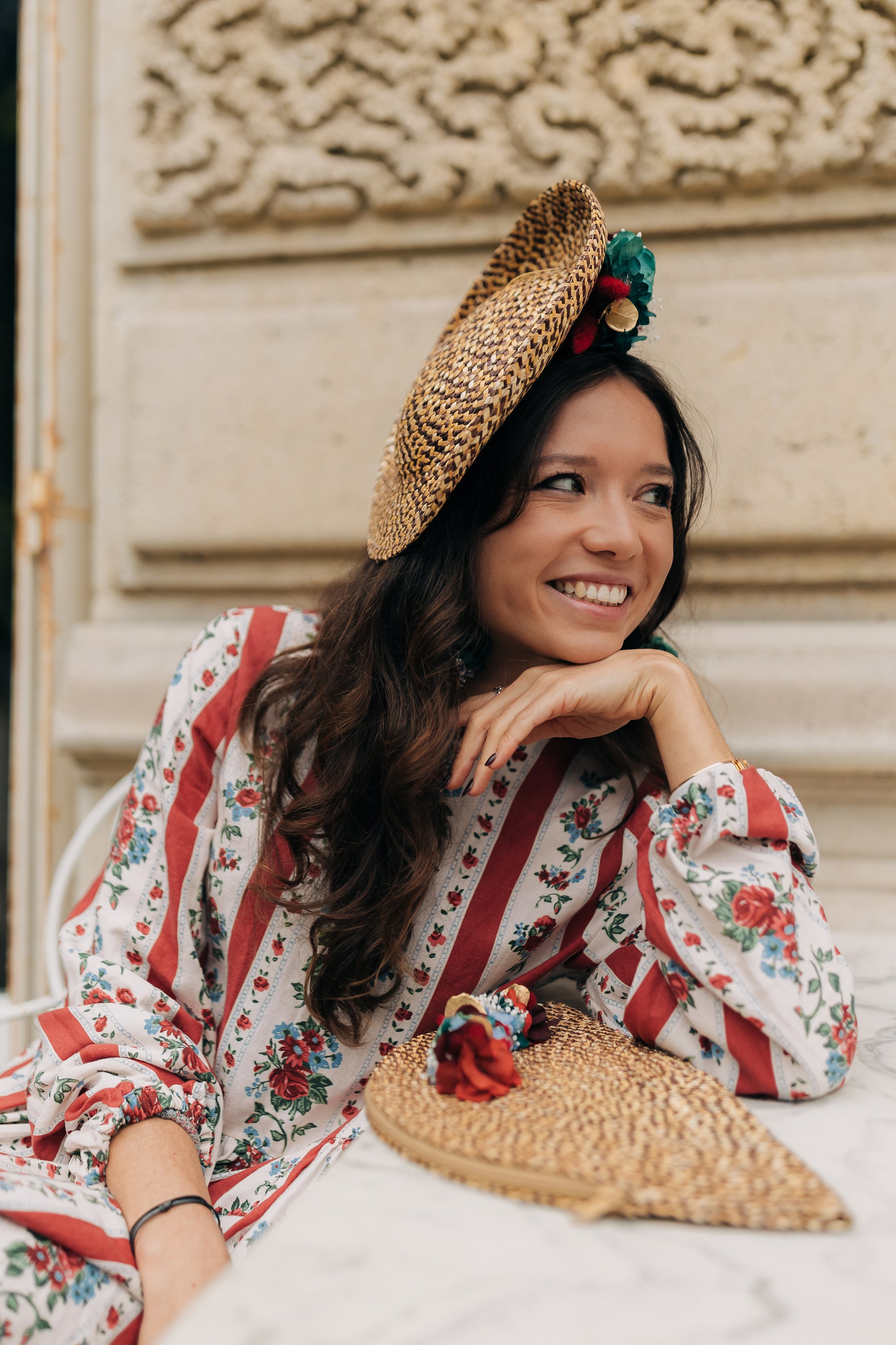 Découvrez Sarah Bernhardt, un bibi élégant et raffiné, façonné à la main en paille bicolore marron-beige, où chaque détail reflète l’élégance et la poésie de la Belle Époque. Sa forme incurvée et son port légèrement incliné apportent un maintien discret et un port de tête gracieux, sublimant votre silhouette avec finesse. Sous le bord du bibi, un délicat décor de fleurs stabilisées vient enrichir la pièce, ajoutant légèreté, mouvement et raffinement.