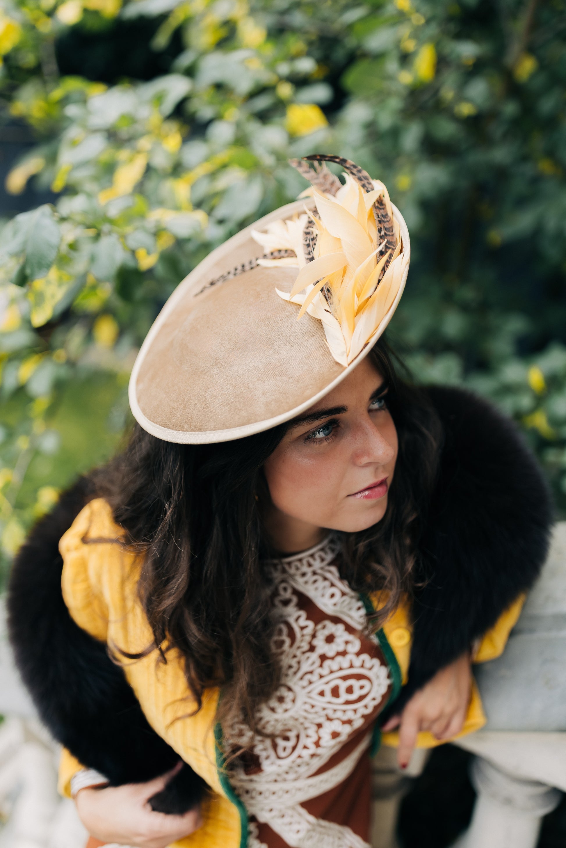 Inspiré des femmes de Mucha, il célèbre l’opulence poétique de cette époque : des plumes de coq et de faisan, aux reflets chatoyant, s’épanouissent comme une chevelure ondoyante, tandis que de fines arabesques évoquent les lignes sinueuses de l’Art Nouveau. La teinte moutarde rappelle les affiches emblématiques où sensualité et majesté ne font qu’un.