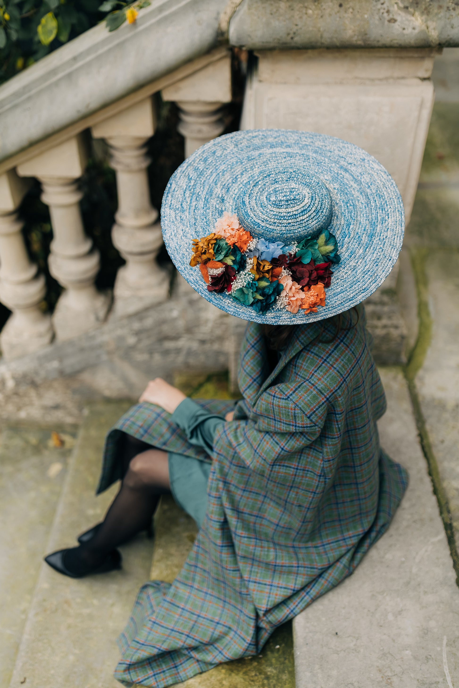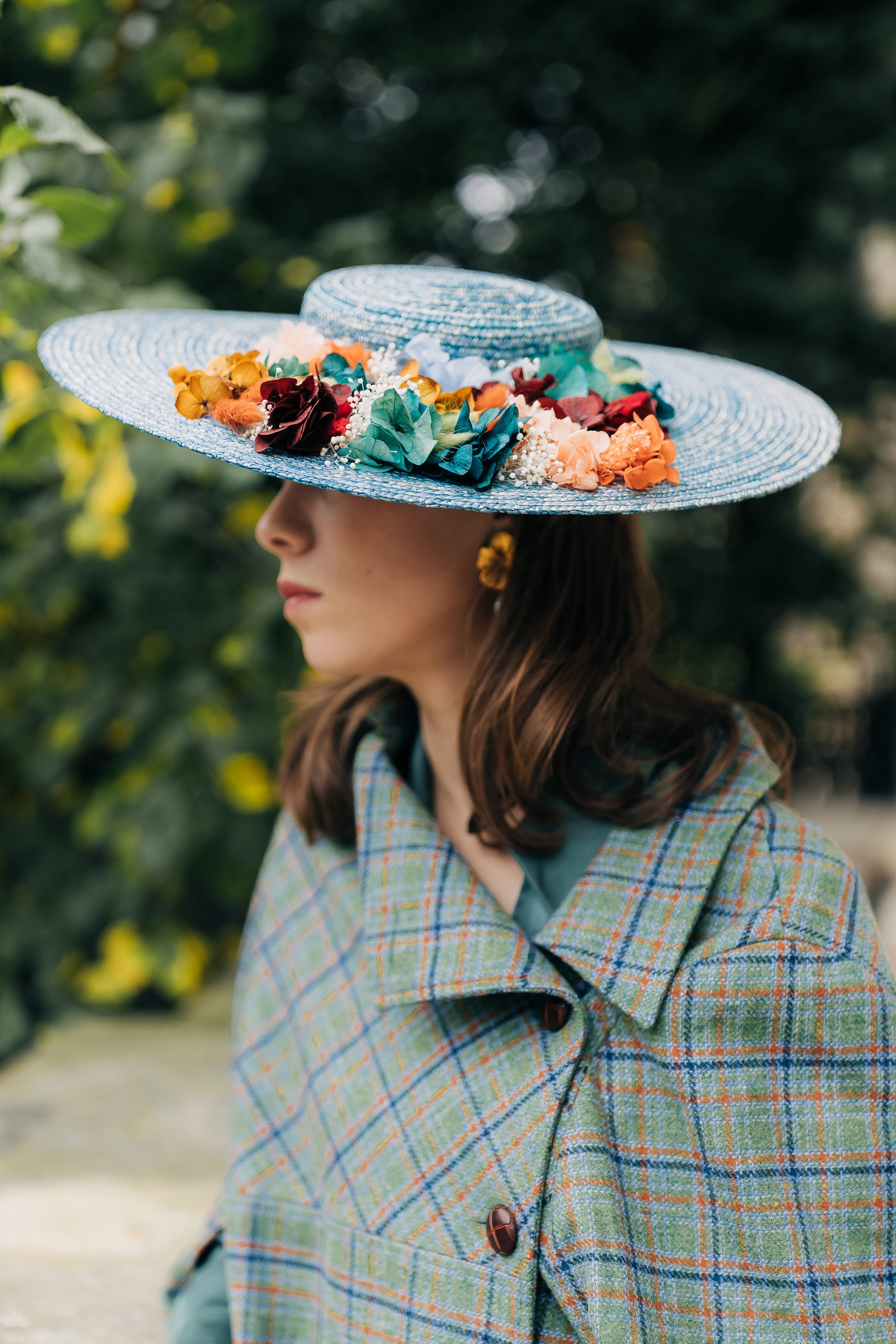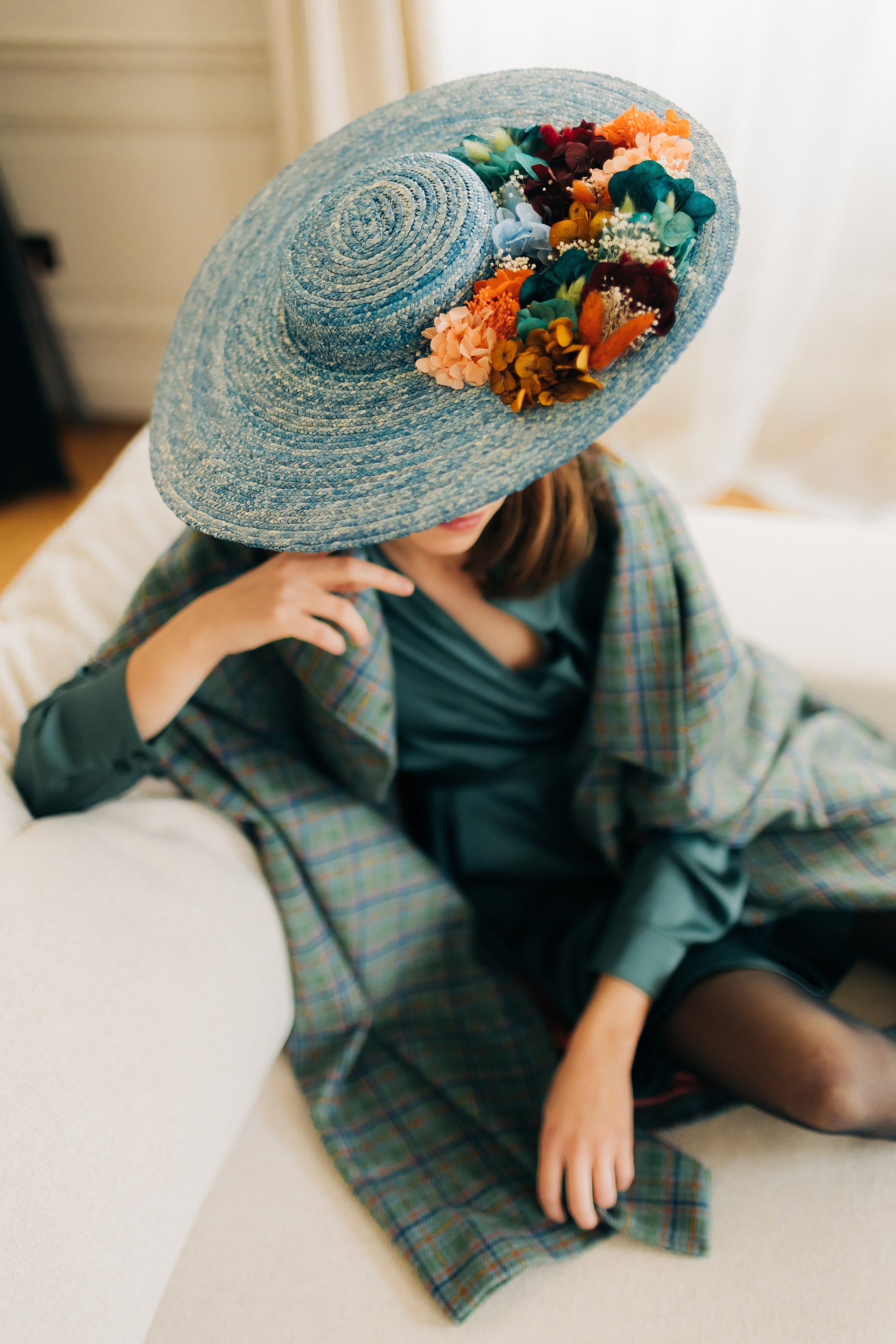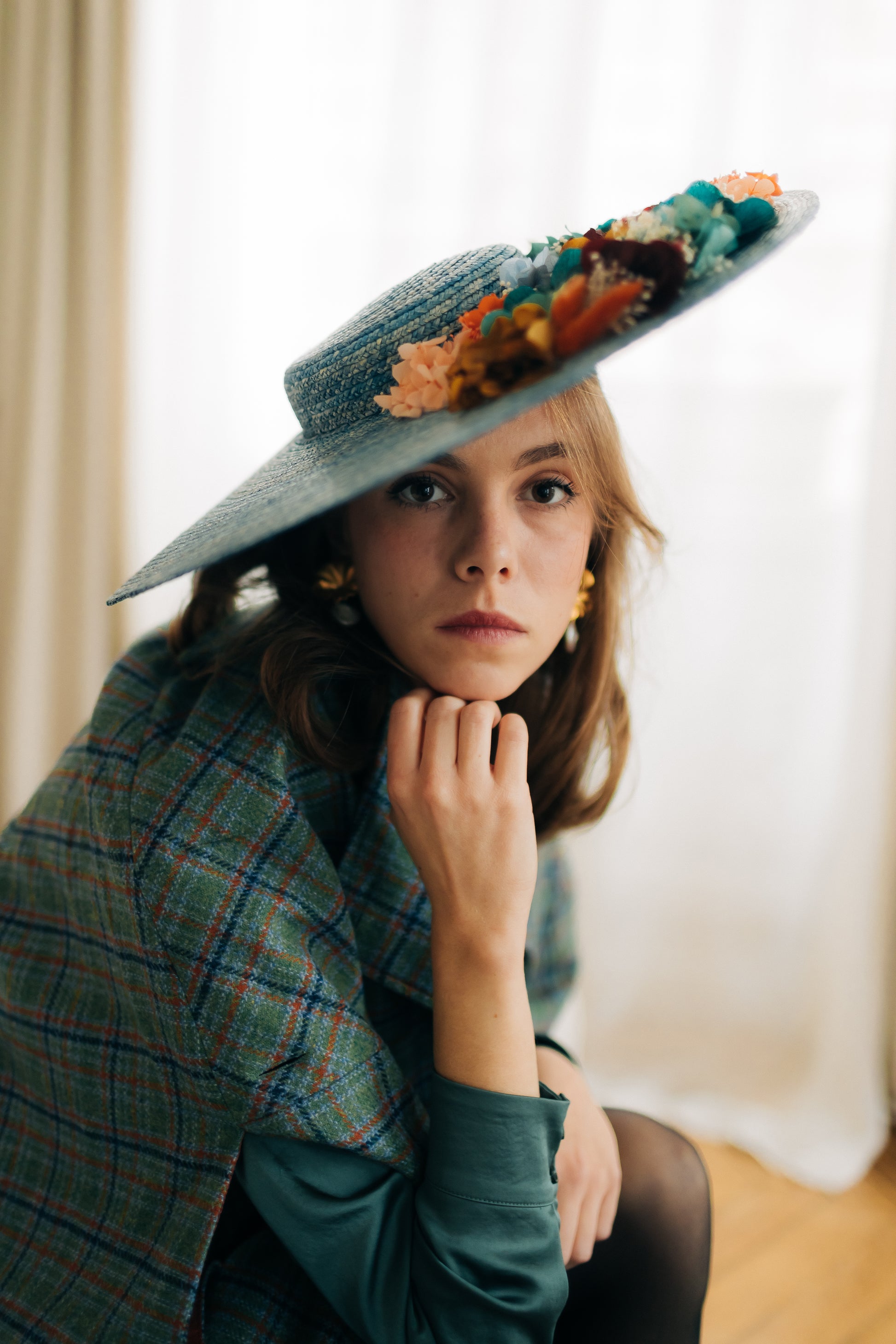 Découvrez Gismonda, une capeline élégante et poétique, façonnée à la main en paille bleue, où chaque détail raconte l’élégance raffinée de la Belle Époque. Sa forme large et délicatement incurvée, pensée pour être portée légèrement inclinée, confère à votre silhouette un port de tête gracieux et noble. Sous le bord généreux, un décor de fleurs stabilisées vient enrichir la pièce, apportant mouvement, légèreté et raffinement.