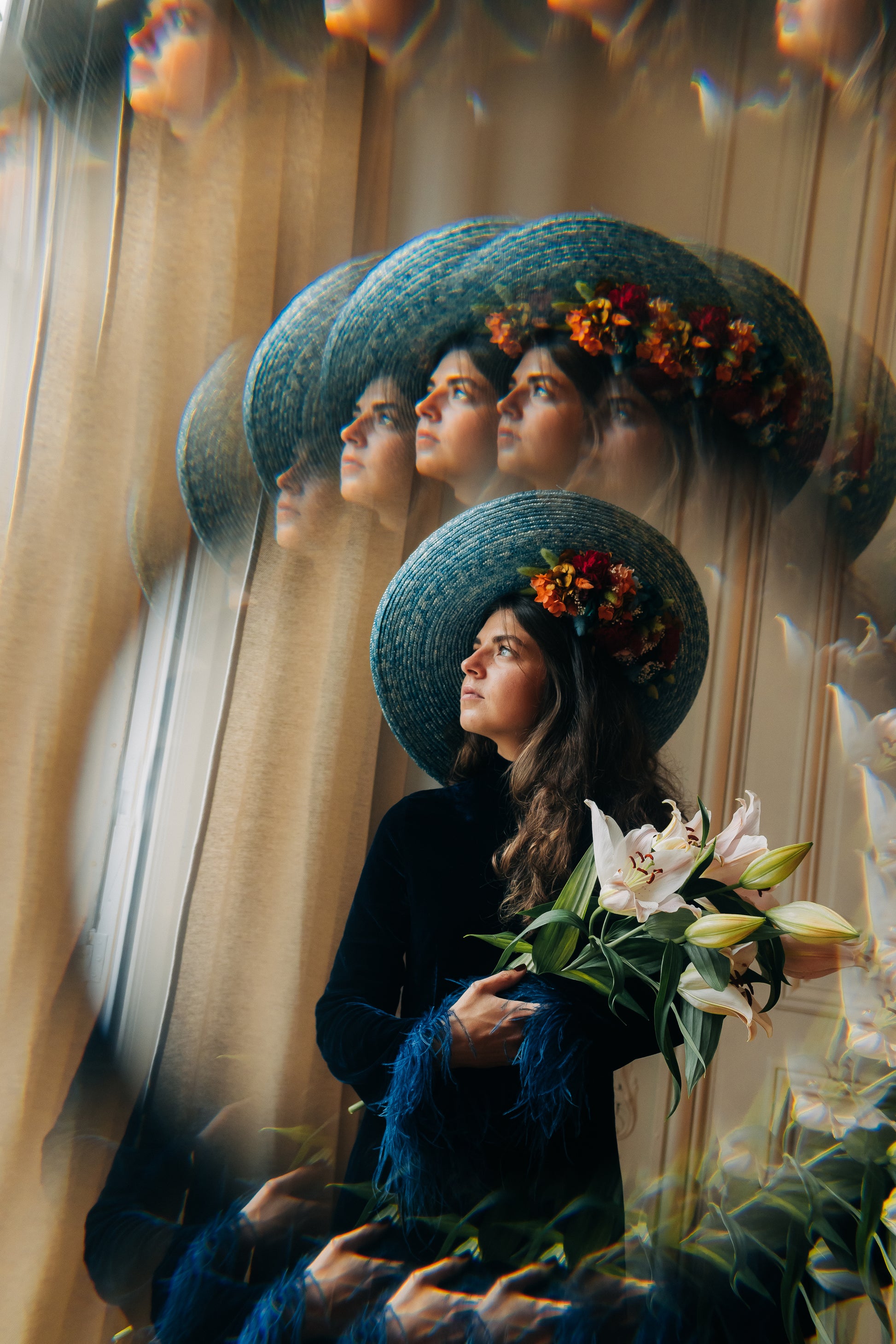 La capeline Gismonda s’inspire des silhouettes féminines et des compositions florales des œuvres de Mucha, avec des lignes aériennes et des motifs organiques évoquant l’Art Nouveau. Les fleurs naturelles se déploient avec grâce autour du chapeau, créant un jeu de textures et de couleurs.