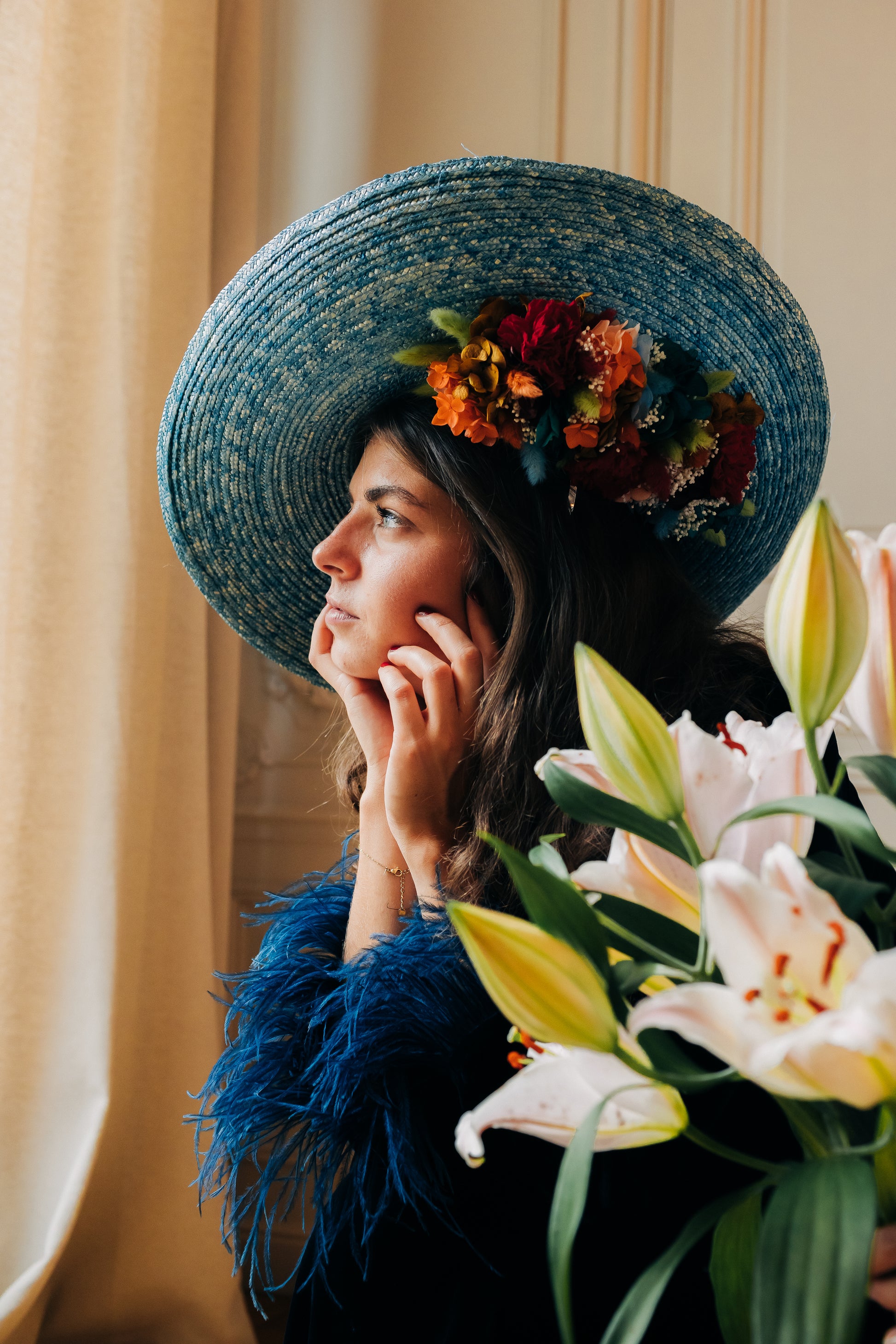Découvrez Gismonda, une capeline élégante et poétique, façonnée à la main en paille bleue, où chaque détail raconte l’élégance raffinée de la Belle Époque. Sa forme large et délicatement incurvée, pensée pour être portée légèrement inclinée, confère à votre silhouette un port de tête gracieux et noble. Sous le bord généreux, un décor de fleurs stabilisées vient enrichir la pièce, apportant mouvement, légèreté et raffinement.
