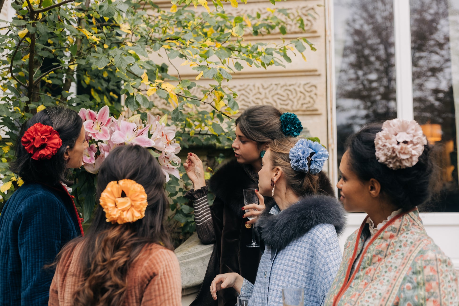 Des turbans de soie ou de laine, drapés à la main, rehaussés de fleurs stabilisées et de nœuds dorés, pour évoquer la sensualité feutrée des soirs d’hiver parisiens.