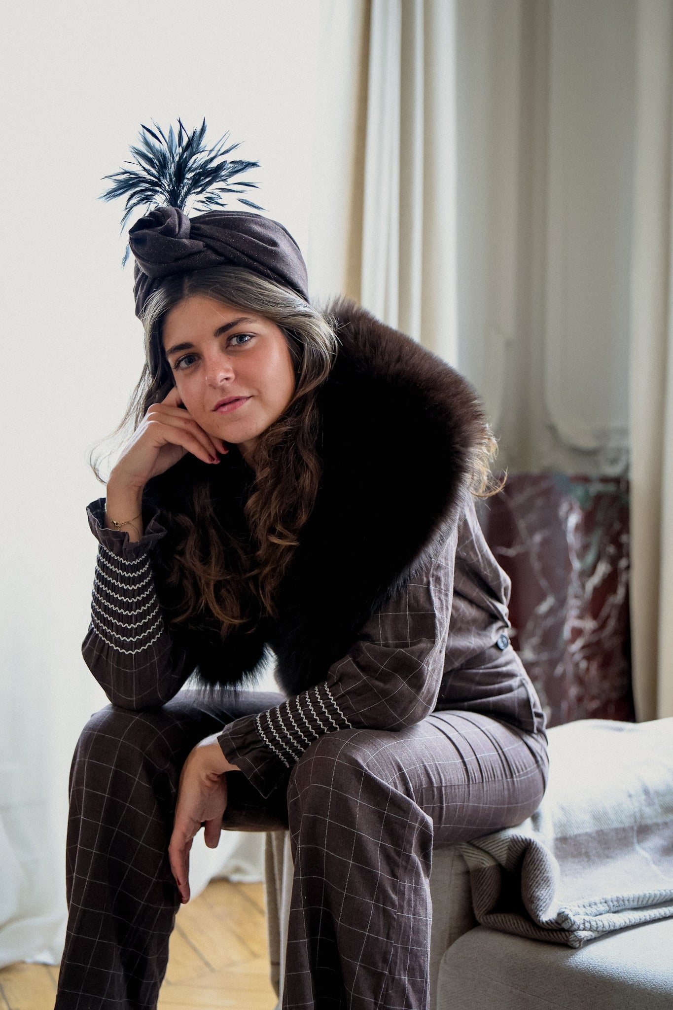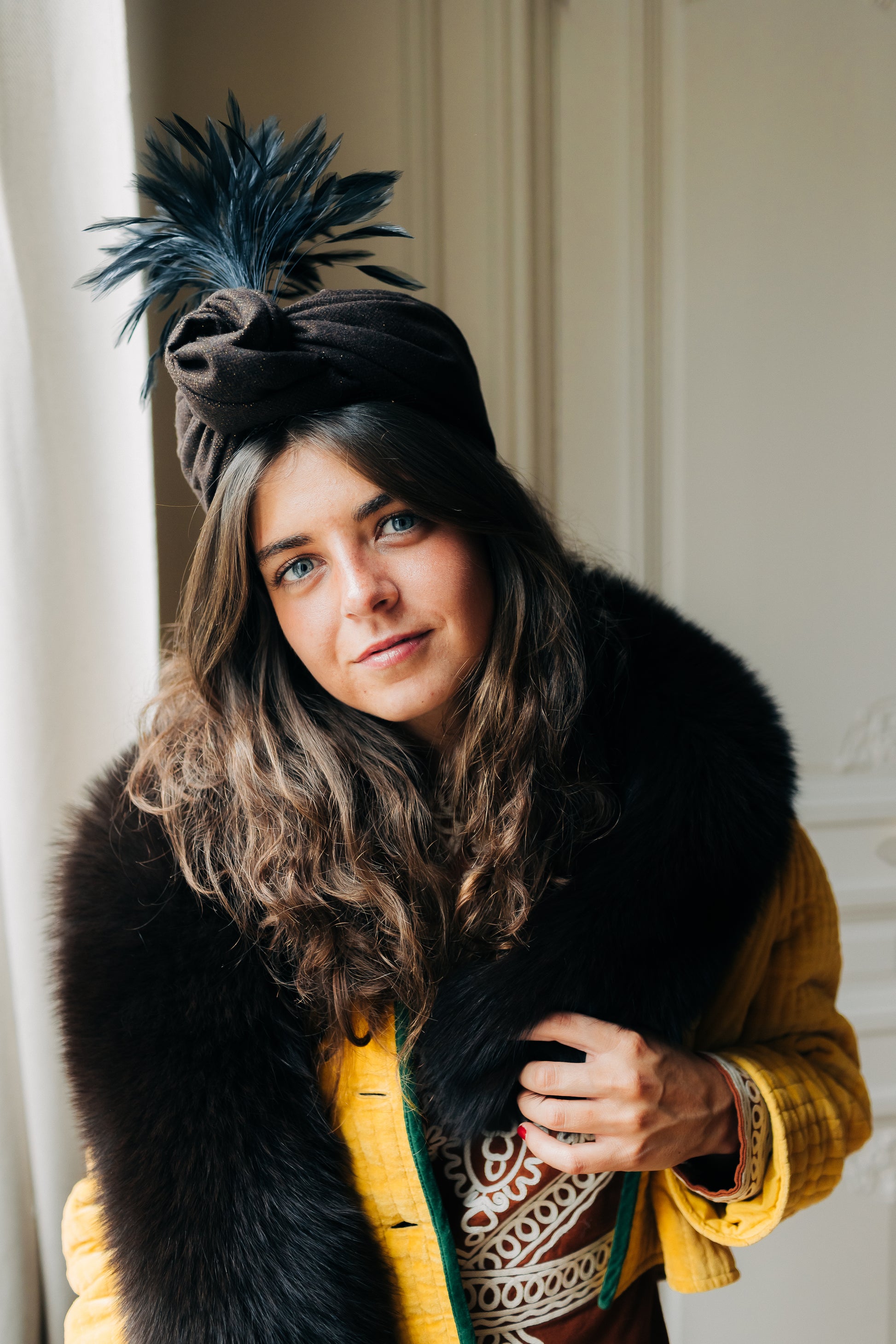 - Le turban est imaginé par la créatrice et confectionné avec soin à Paris