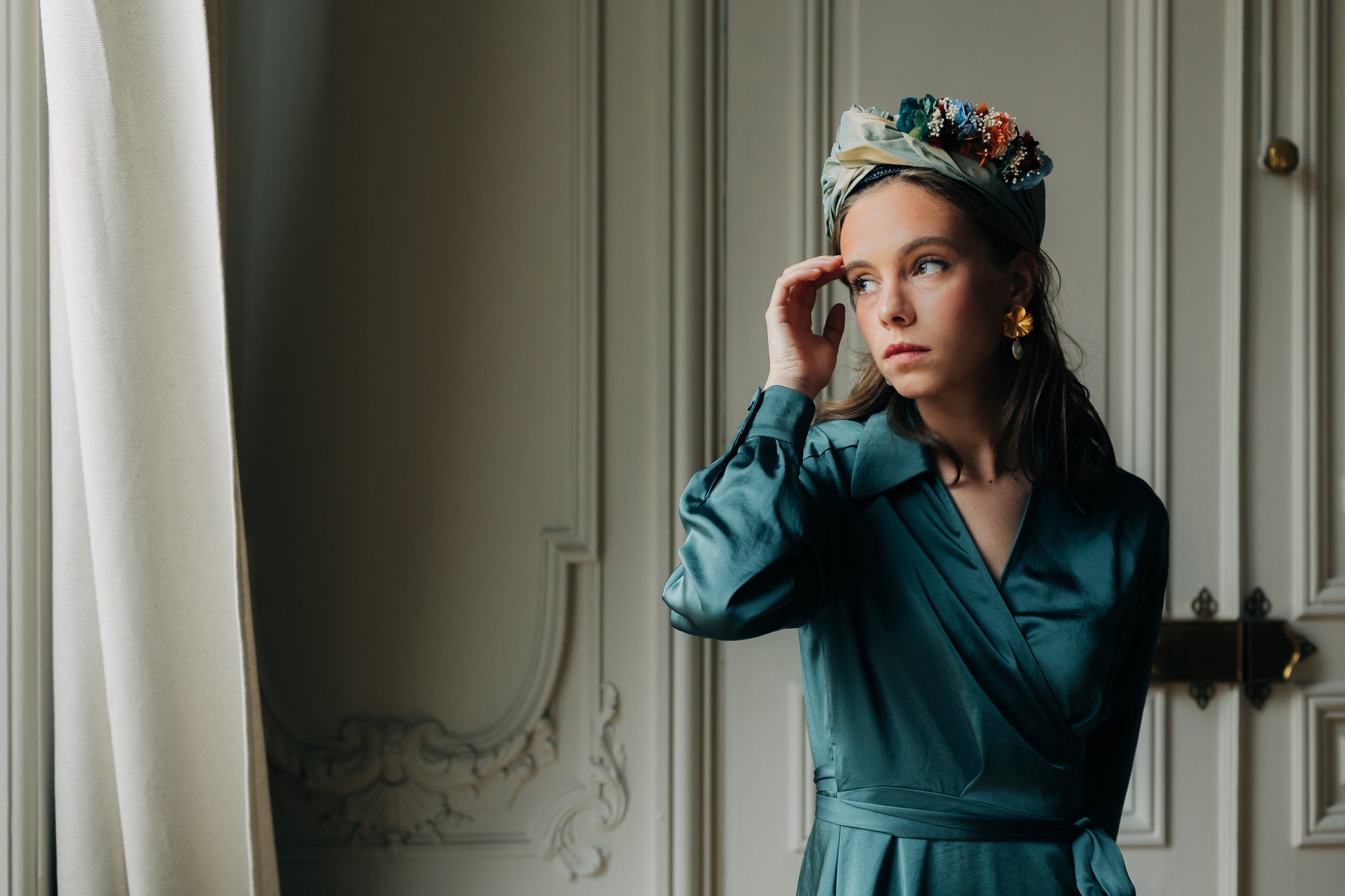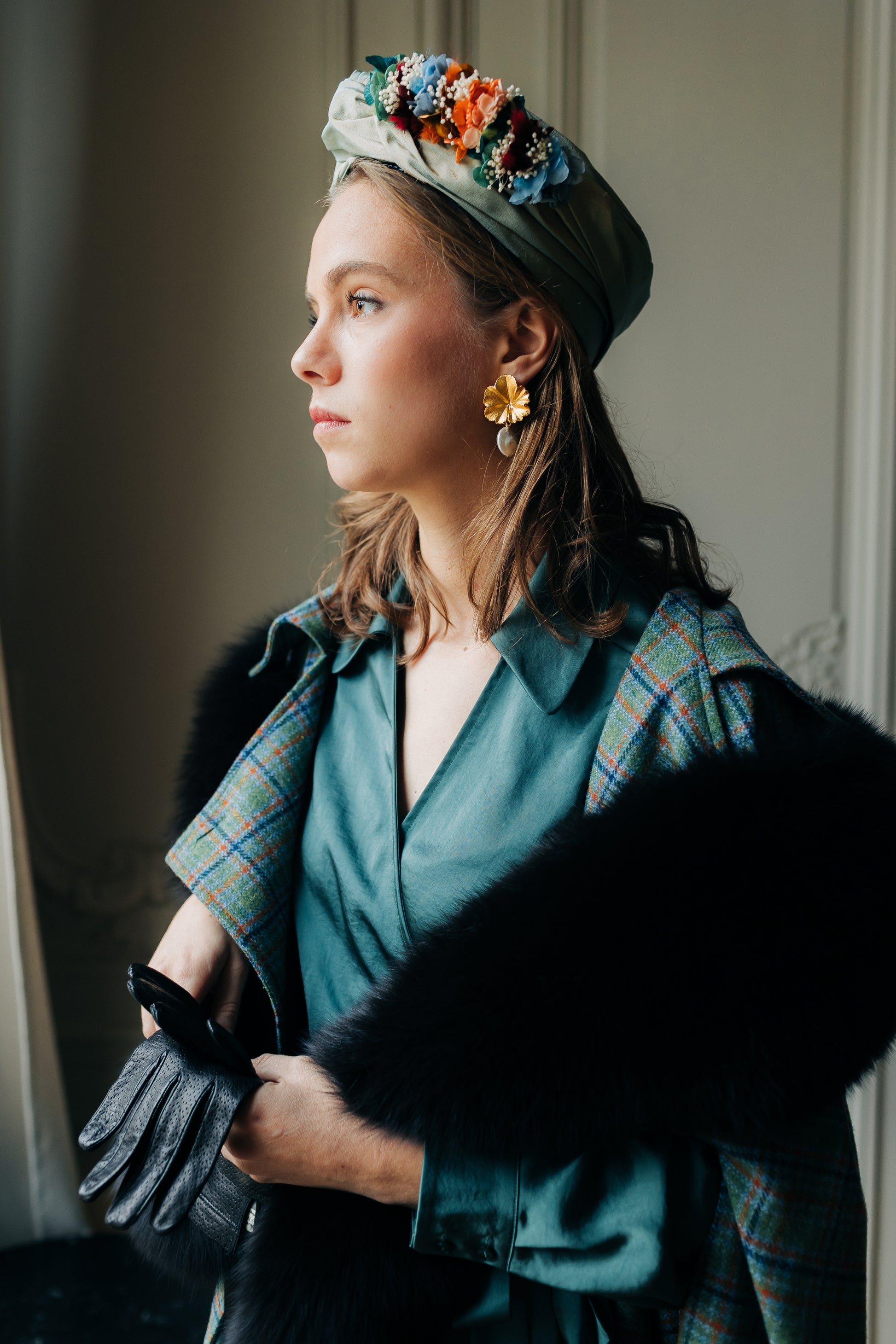 Des turbans de soie ou de laine, drapés à la main, rehaussés de fleurs stabilisées et de nœuds dorés, pour évoquer la sensualité feutrée des soirs d’hiver parisiens.